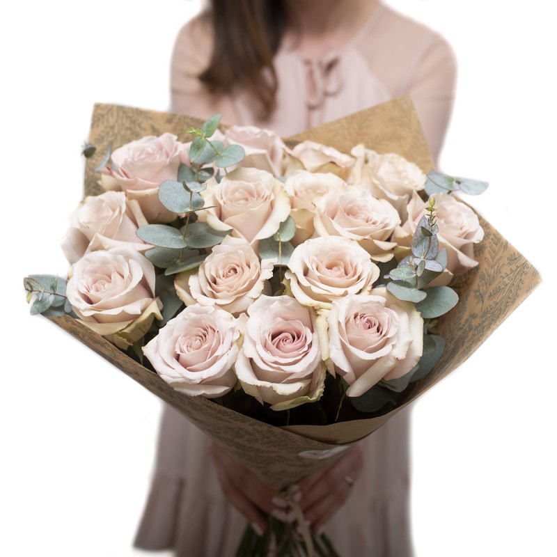 Quicksand - Kreator róż.  to połączenie ekwadorskiej róży odmiany Quicksand  z pastelową zielenią eukaliptusa. Całość otulona papierem. Bukiet na zdjęciu został ułożony z róż o długości minimum 50cm.