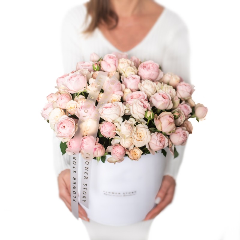 Love Pastels to okazała kompozycja kwiatowa, która urzeka subtelnością i delikatnością. Starannie ułożona w eleganckim, białym welurowym boxie, składa się z kremowo-różowych róż gałązkowych. Te drobne, pełne wdzięku kwiaty symbolizują delikatność i romantyzm, tworząc harmonijną aranżację, która wspaniale prezentuje się na tle luksusowego, miękkiego weluru. Pastelowe odcienie róż i kremu nadają bukietowi lekkości, a jednocześnie podkreślają jego wyrafinowany charakter.
